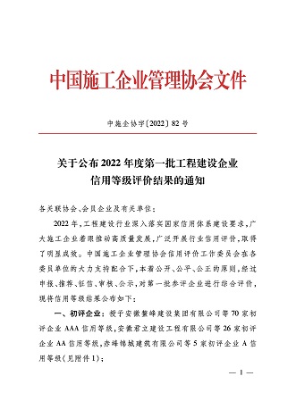 再次荣获施工企业最高信用评级“AAA级企业信用证书”。这是对开云在线登录官网-开云中国
