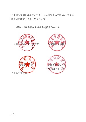 根据《安徽省优秀建筑业企业认定暂行办法》和《关于开展安徽省优秀建筑业企业认定有关工作的通知》。省住房城乡建设厅会同省交通运输厅、省水利厅、省通信管理局组织开展了2021年度安徽省优秀建筑企业认定工作。