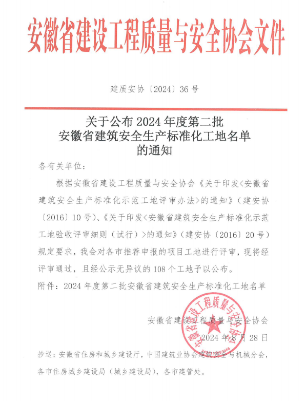 近日,安徽省建设工程质量与安全协会公布2024年度第二批安徽省建筑安全生产标准化工地名单,由开云在线登录官网-开云中国