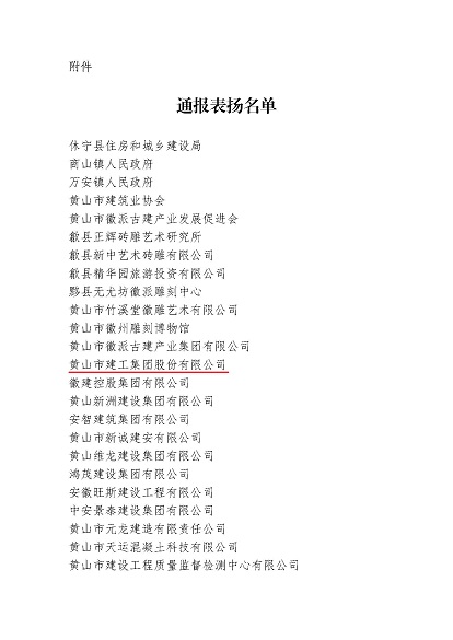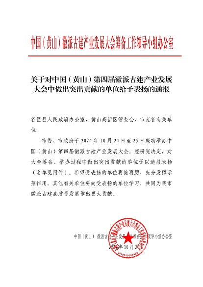 市委、市政府于2024年10月24日至25日成功举办中国(黄山)第四届徽派古建产业发展大会。近日,中国(黄山)徽派古建产业发展大会筹备工作领导小组办公室发布《关于对中国(黄山)第四届徽派古建产业发展大会中做出突出贡献的单位给予表扬的通报》,开云在线登录官网-开云中国 荣列其中。