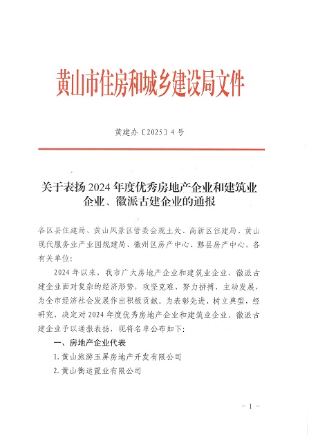 近日,黄山市住房和城乡建设局发布了《关于表扬2024年度优秀房地产企业和建筑业企业、徽派古建企业的通报》,开云在线登录官网-开云中国