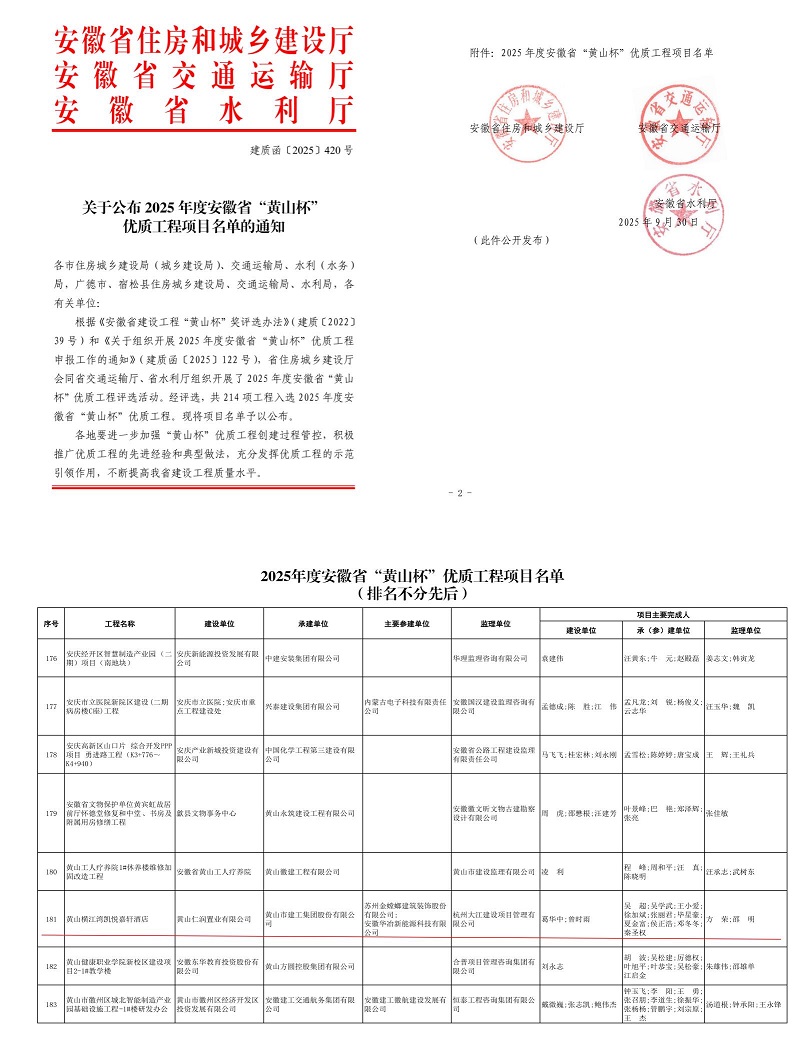 近日,安徽省住房和城乡建设厅、安徽省交通运输厅、安徽省水利厅联合公布了2025年度省“黄山杯”优质工程项目名单,黄山市建工集团承建的黄山横江湾凯悦嘉轩酒店项目成功入选,荣膺安徽省建设工程质量最高荣誉——“黄山杯”奖。