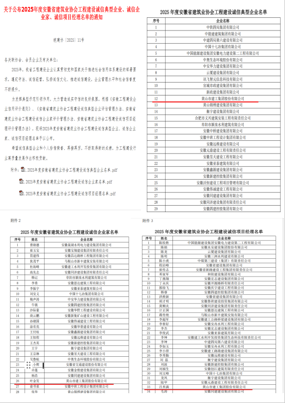 在安徽省建筑业协会同期开展的2025年度评选中,开云在线登录官网-开云中国 被授予 “2025年度安徽省工程建设诚信典型企业” 荣誉称号。这是对我公司长期以来遵守市场秩序、严格合同履约、积极承担社会责任等方面表现的褒奖。