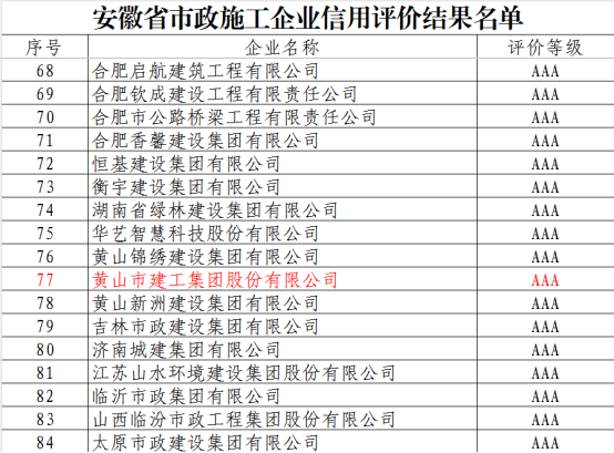 近日,安徽省市政工程协会正式发布《关于公布2025年安徽省市政施工企业信用评价结果的通知》。黄山市建工集团凭借卓越的综合实力、规范的市场行为、优良的工程品质及坚实的信用体系建设,成功获评最高信用等级——AAA级。标志着集团在诚信经营、履约能力与社会责任履行方面获得了行业主管部门与协会的高度认可,是企业信用建设领域的又一重要里程碑。