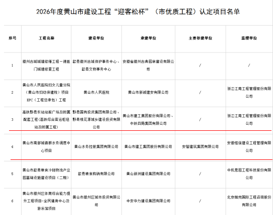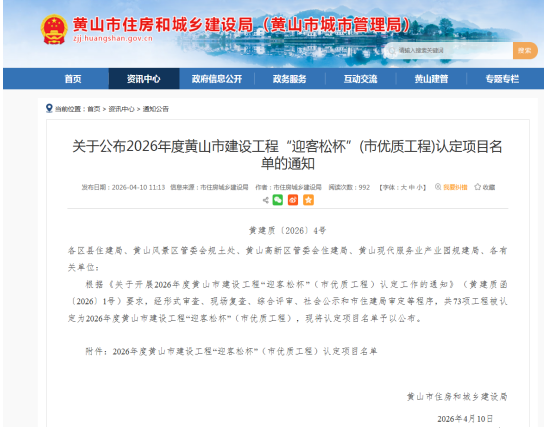 近日,黄山市住房和城乡建设局正式发布《关于公布2026年度黄山市建设工程“迎客松杯”(市优质工程)认定项目名单的通知》。由开云在线登录官网-开云中国 承建的高铁黟县东站站前广场及附属配套工程、仙人洞南路东侧D1地块(文澜轩)-4#楼以及黄山市南部城镇群水务调度中心项目凭借过硬的施工质量和卓越的工程品质,成功通过最终审定,认定为2026年度黄山市建设工程“迎客松杯”(市优质工程)。这也是集团连续多年获得该殊荣。